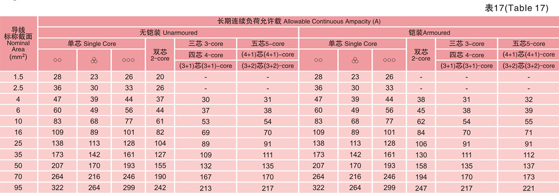 電纜載流量(見表17-20)